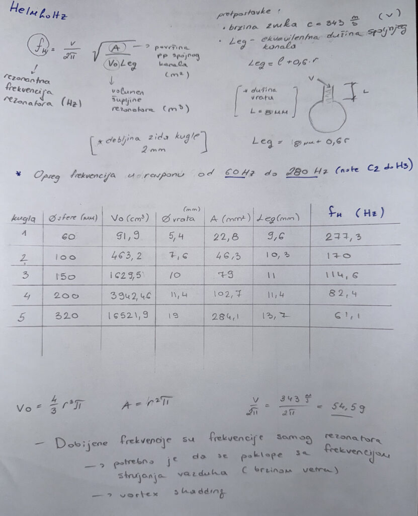 Prikazana je formula za rezonantnu frekvenciju i proračun odnosa između zapremine šupljine, otvora, dužine vrata i frekvencije, koji predstavlja osnovu za formiranje različitih zvučnih frekvencija