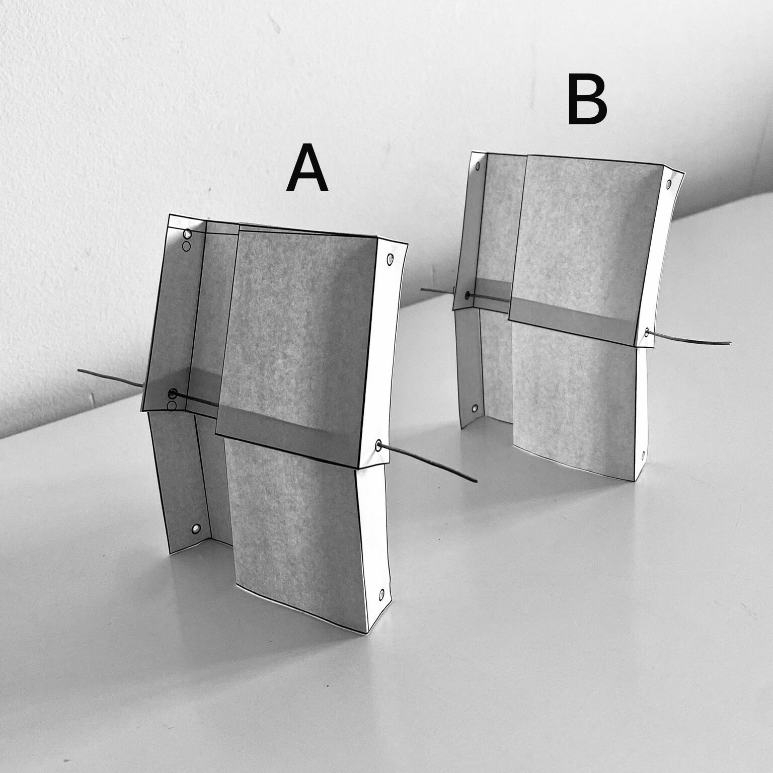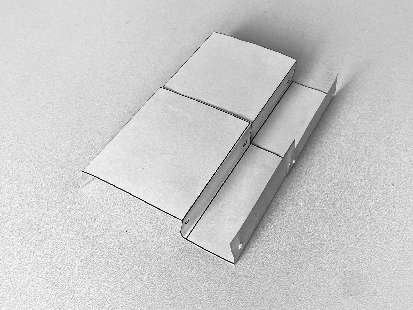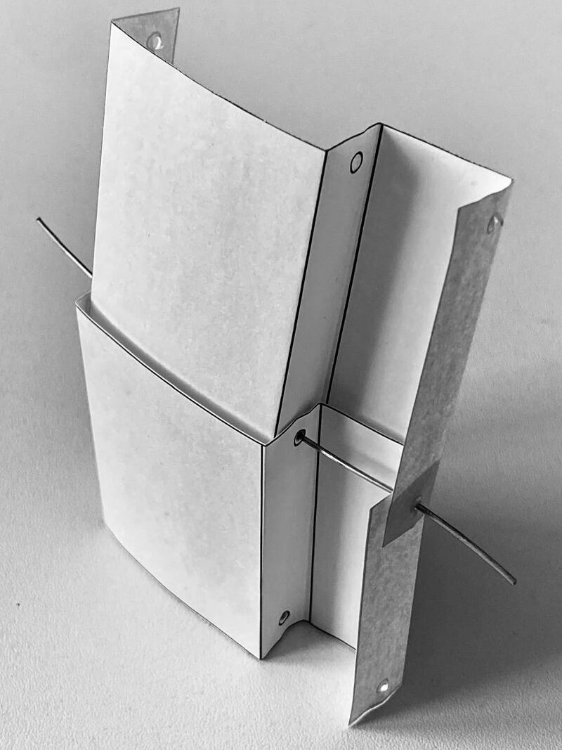 Takav oblik je odabran zato što spaja funkcionalnu i formalnu ideju projekta: svaka jedinica ponaša se kao strukturni segment koji prenosi opterećenje sa prethodnog na sledeći, dok vizuelno stvara ritam i dinamiku u prostoru. Zbog origami karaktera konstrukcije, površina elementa tretirana je kao savijeni materijal koji ima jasno izražene ivice.