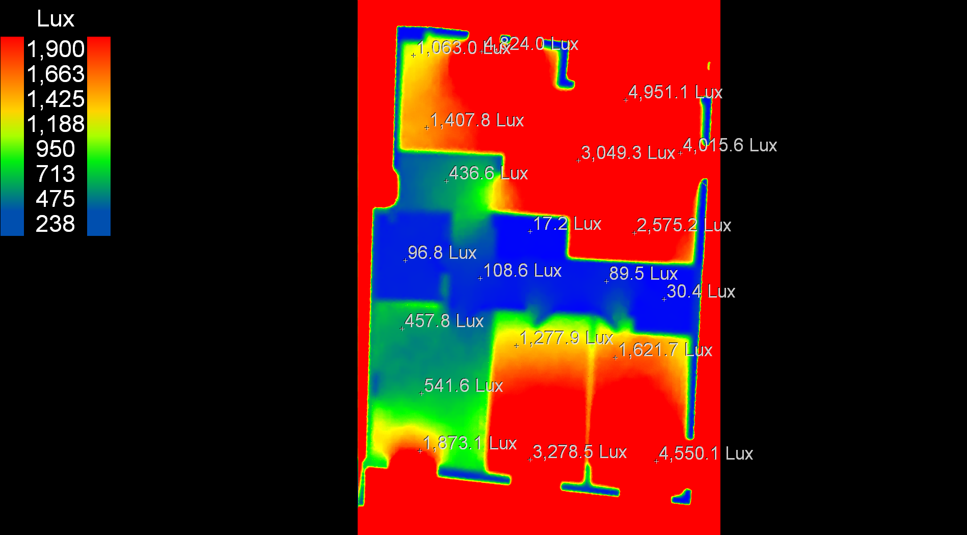 Iako dosta veći stan od prethodnih, u ovom slučaju se negira zaključak iz WFR analize da veći stanovi imaju lošiju osvetljenost. U stanu broj 4 površine 130 metara kvadratnih je svaka prostorija odlično osvetljena osim jedne spavaće sobe koja ima blago manju osvetljenost od ostalih prostorija. Zaključak je da ne treba menjati dimenzije otvora i morfologiju stana koja je dobro projektovana. Kao i u svakom slučaju komunikacije i toaleti su kritične tačke.