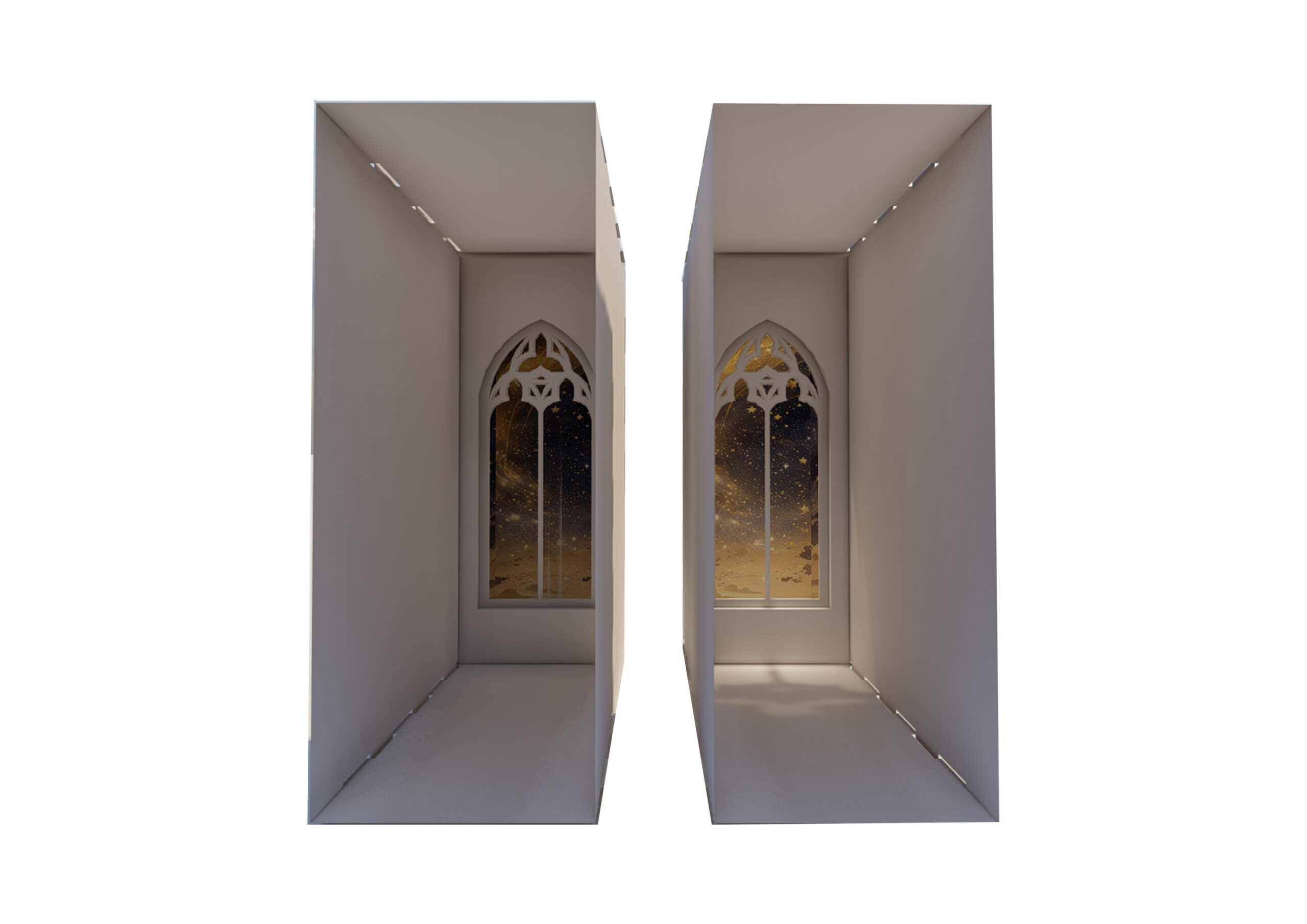 The modeling results show that a semi-circular background creates a stronger illusion of depth and provides a more realistic immersive effect than a rectangular one. In addition, interchangeable backgrounds-such as a starry sky, a castle, or a forest-allow the atmosphere of the booknook to shift according to mood, making the model both versatile and customizable.