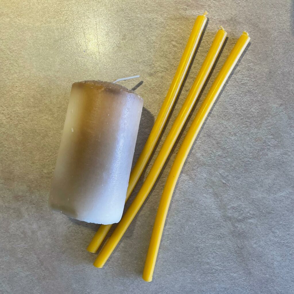 Tokom procesa materializacije koristila sam dve vrste sveća: žute, crkvene sveće i belu sveću. Primetila sam jasnu razliku u njihovim osobinama: žute sveće su bile znatno elastičnije i lako su se savijale, dok se bela sveća prilikom sečenja krunila i pokazivala manju elastičnost. Na osnovu toga zaključila sam da su žute sveće pogodnije za delove na mojoj maketi koji su krhkiji i skloniji oštećenjima.