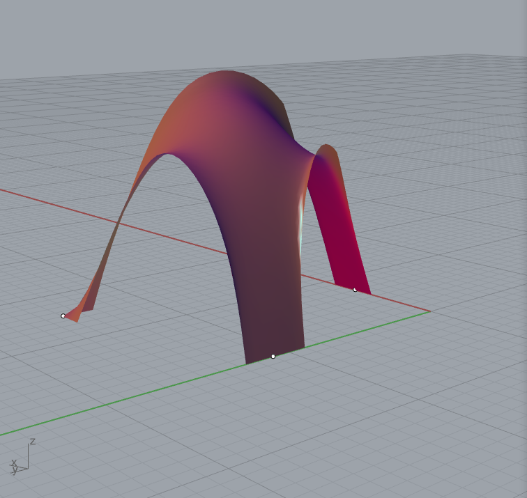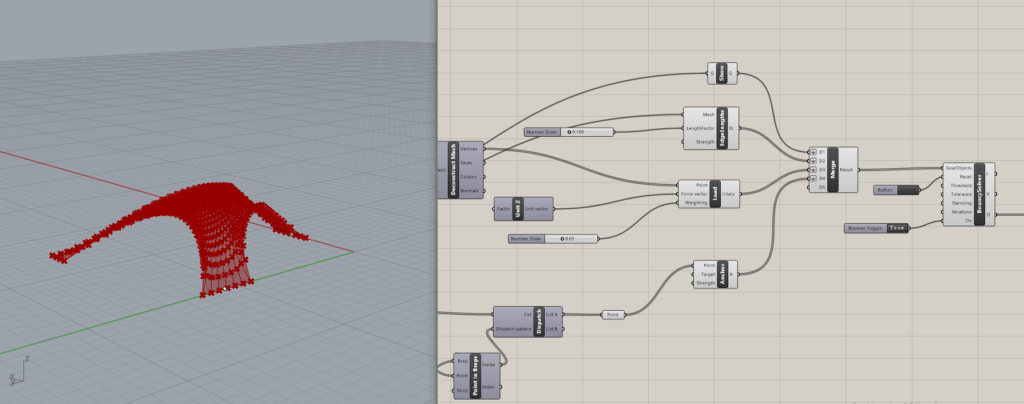 Nakon toga, treba da dodam tačke koje želim da ostanu fiksirane za dno. One će u većini slučajeva predstavljati oslonce. Proizvoljno biram tačke i postavljam ih na stranice koje uokviruju moju površinu. Da bih preciznije kontrolisala koja mesta mesh-a ostaju fiksirana tokom simulacije, oko odabranih tačaka postavila sam sfere. One služe kao delovi konstrukcije koji treba da ostanu na istom mestu i drže oblik dok se ostatak mreže deformiše. Takođe, postavljam i radius sfere tako da mogu da utičem na veličinu obuhvaćenog dela. Tu koristim komponentu dispatch kako bih razvrstala tačke u dve grupe. Prva, koja meni treba, jesu tačke koje se nalaze u sferi i na ivicama pravougaonika (naked points) i druge koje se nalaze van oformljenih sfera. Tačke koje upadnu u sferu postaju fiksni oslonci u simulaciji, dok preostale ostaju slobodne da se deformišu prateći Kangaroo ciljeve.