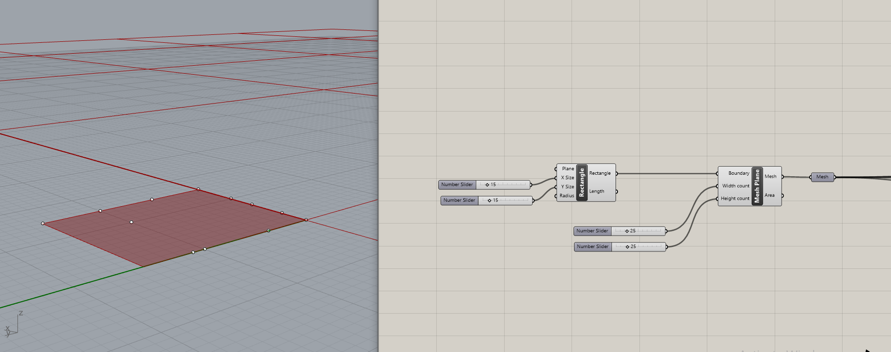 Za početak formiram pravougaonik veličine koje želim da bude moj kalup. Pravougaonik zatim delim na određen broj segmenata po širini i visini, kako bi nastala mreža dovoljno gusta za kasniju deformaciju.Potrebno je da postoji veliki broj segmenata zato što računar zakrivljenost uvek aproksimira malim ravnim elementima. Od ovakve površine formiram mesh, koji mi služi kao osnovna baza za dalji nastavak.