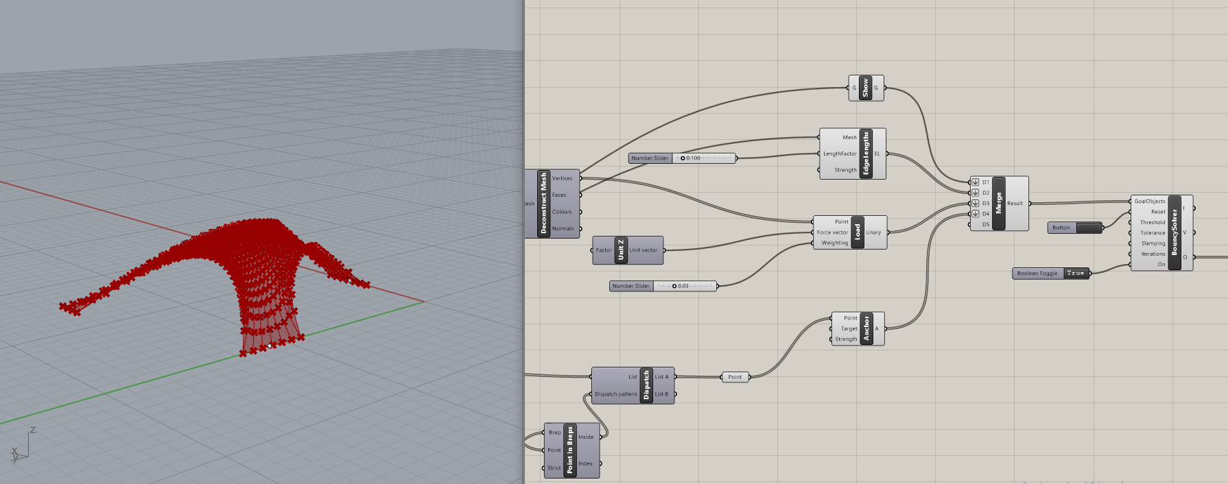 Ciljeve koje sam ja zadala su Edge Length koji kontoliše koliko će duboko mreža da se savije i Load koji zadaje silu u određenom smeru, u ovom slučaju to je sila u Z pravcu. Sve to sam spojila u komponentu BouncySolver, čijim sam eksperimentisanjem i kombinovanjem došla do željenog oblika strukture.