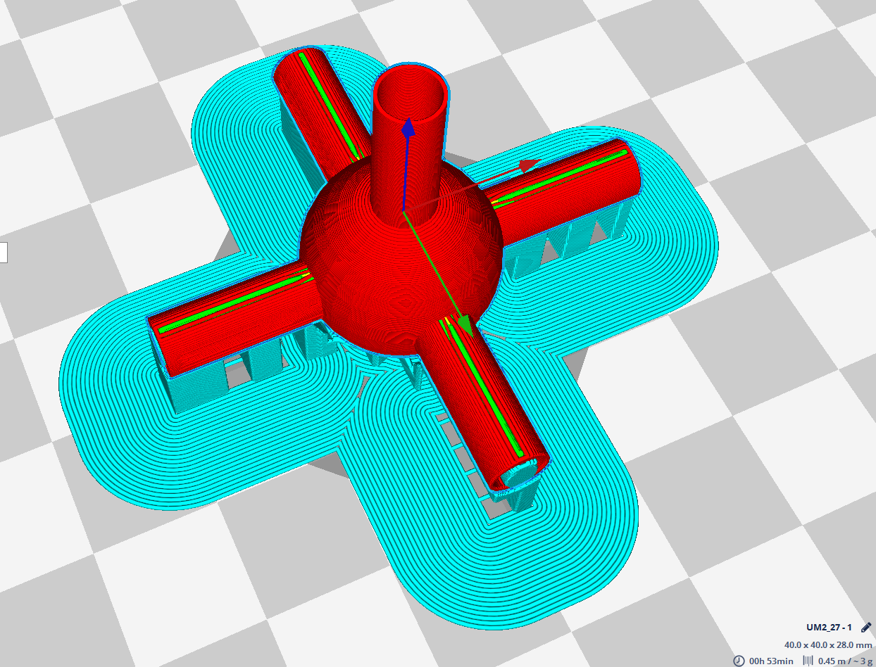 Cura daje prikaz svih slojeva koji će se štampati. Crvenom bojom je obeležen model, a plavom potkonstrukcija koja mora biti skinuta nakon štampanja. U donjem desnom uglu, softver daje približno vreme koje je potrebno za štampu (koje nije najpreciznije) kao i potrebnu količinu materijala.