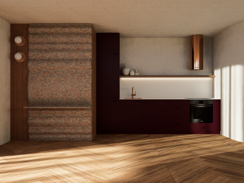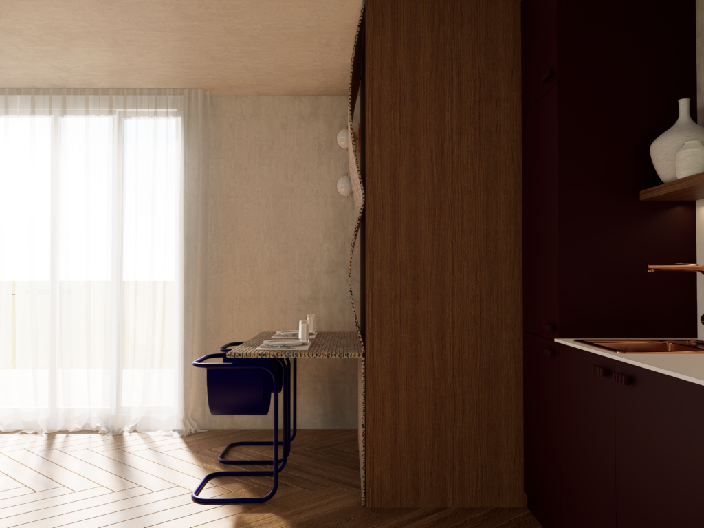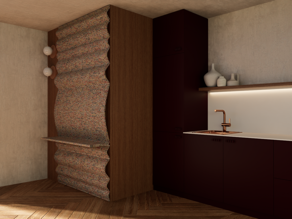 U zatvorenom položaju panel vizuelno doprinosi prostoru kroz ritam senki, teksturu i materijalnost, dok u otvorenom položaju zadržava stabilnost i ergonomske dimenzije potrebne za svakodnevnu upotrebu. Uvođenjem materijala toplih tonova drveta i taktilnih površina, postignuta je ravnoteža između tehnološkog pristupa i vizuelne mekoće forme.