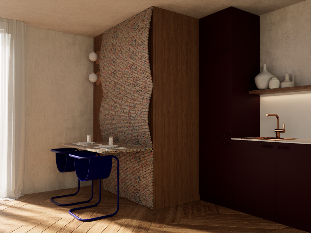 Konačni rezultat istraživanja prikazan je kroz 3D vizualizacije koje ilustruju funkcionalnost i estetski potencijal predloženog rešenja. Na prikazima je predstavljena prostorna integracija stola koji se sklapa u zidni panel, oblikovanog u fluidnoj, talasastoj formi. Panel u zatvorenom stanju funkcioniše kao dekorativni zidni element sa skulpturalnim karakterom, dok se u otvorenom stanju transformiše u sto za dve osobe.