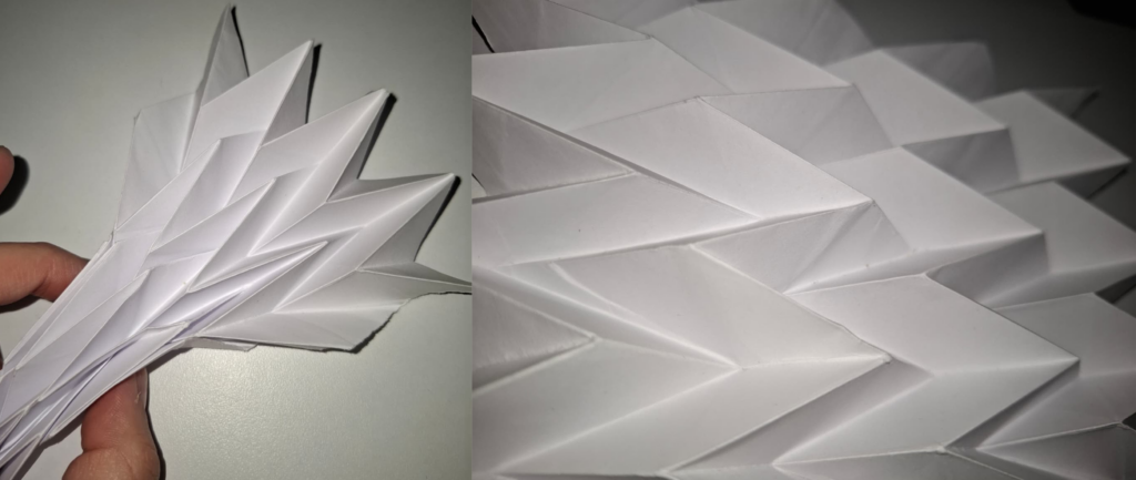 Tokom istraživanja, kao potencijalno rešenje, uočena je Miura Ori tehnika, koja potiče iz japanskog origamija i omogućava pravljenje fleksibilnih i kontinuiranih površina. Ovaj šablon savijanja omogućava da se materijal preklapa u više slojeva bez stvaranja otvora, što znači da bi membrana mogla potpuno da zaustavlja svetlost tamo gde je potrebno. U kontekstu našeg istraživanja, Miura Ori bi mogla da pruži zadovoljavajuće rezultate, poboljšavajući funkcionalnost i estetski dojam panela, dok istovremeno zadržava fleksibilnost i praktičnost izvođenja. Plan je da se ova metoda detaljnije istraži u narednim fazama, kako bi se uporedila sa rešenjem dobijenim metodom lepeze.