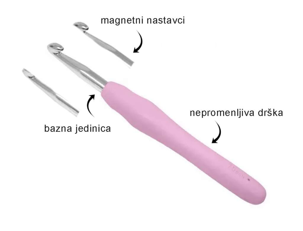 Tokom istraživanja prve ideje, razvila sam koncept heklice koja se sastoji iz dva dela spojena magnetima — pri čemu je samo prednji deo, do drške, bio zamenjiv, dok je drška ostajala ista. Međutim, kroz dalju analizu i testiranja pokazalo se da takvo rešenje ograničava mogućnosti prilagođavanja i otežava održavanje stabilnosti spoja.