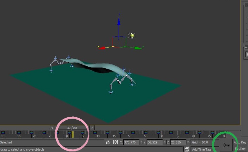 Određivanjem vremena trajanja filma u Time Configuration i dodeljivanjem Key-ova (zeleni krug) na određenim frame-ovima (rozi krug) se kontroliše način pomeranja sunca tokom filma, a sa njim i cele nadstrešnice i njenih nogu.