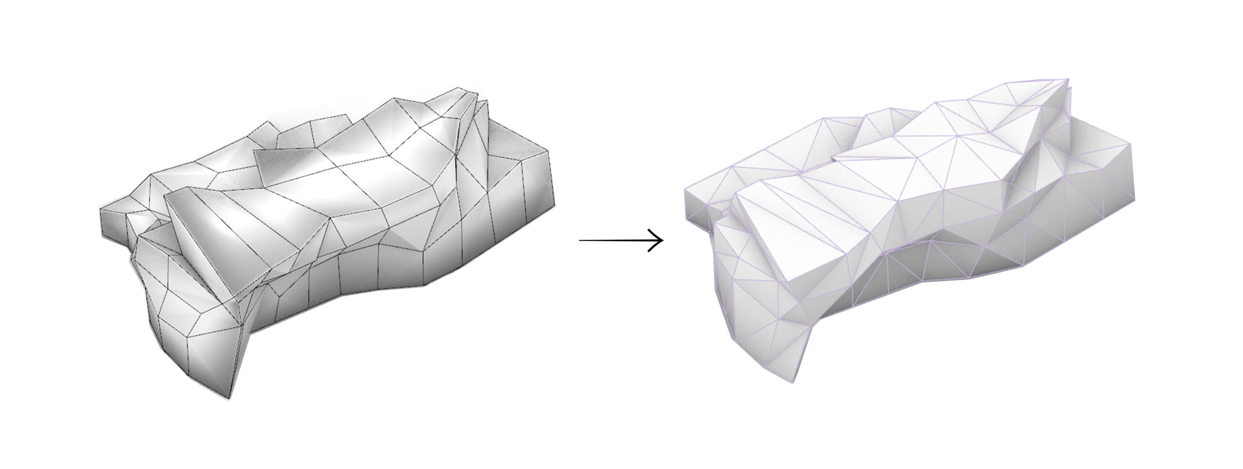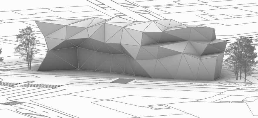 Proces oblikovanja započinje definisanjem osnovne geometrije objekta, koja se uvezuje u Grasshopper okruženje kao multiple Brep radi pojedinačnog modelovanja svakog sprata. Nakon toga, osnovna mreža je konvertovana u quad podelu kako bi se obezbedila ujednačenija struktura i lakša kontrola promena u daljem procesu. Geometrijske tačke su potom označene, a njihova pomeranja definisana nasumično duž X, Y i Z osa, pri čemu se vrednosti mogu interaktivno menjati i prilagođavati pomoću slider kontrola. U sledećem koraku, dodate su atraktor tačke koje dodatno utiču na pomeranje tačaka unutar geometrije. Njihov položaj se određuje ručno, dok skripta definiše obim i smer deformacije u odnosu na udaljenost i intenzitet uticaja atraktora. Kombinovanjem dva faktora – nasumičnog pomeranja i atraktorskog uticaja – moguće je precizno odrediti procentualni odnos njihovog dejstva (npr. nasumično 50%, atraktorski uticaj 50%), čime se kontroliše ukupna dinamika deformacije. Na kraju, pomoću slider kontrola definiše se intenzitet pomeranja, odnosno stepen „gužvanja“ forme, čime se dobija finalni oblik koji predstavlja rezultat parametarskog procesa transformacije.