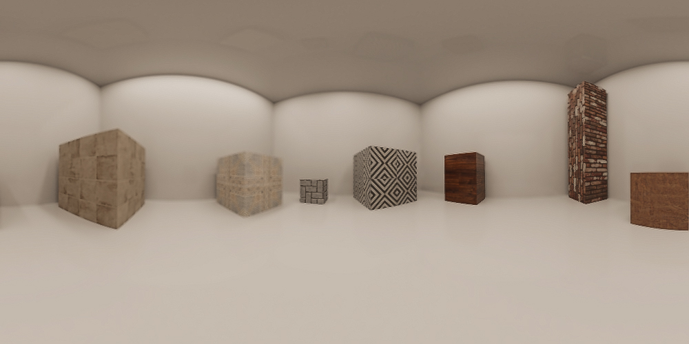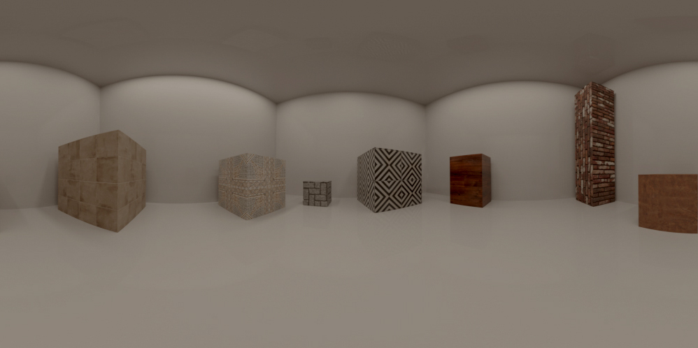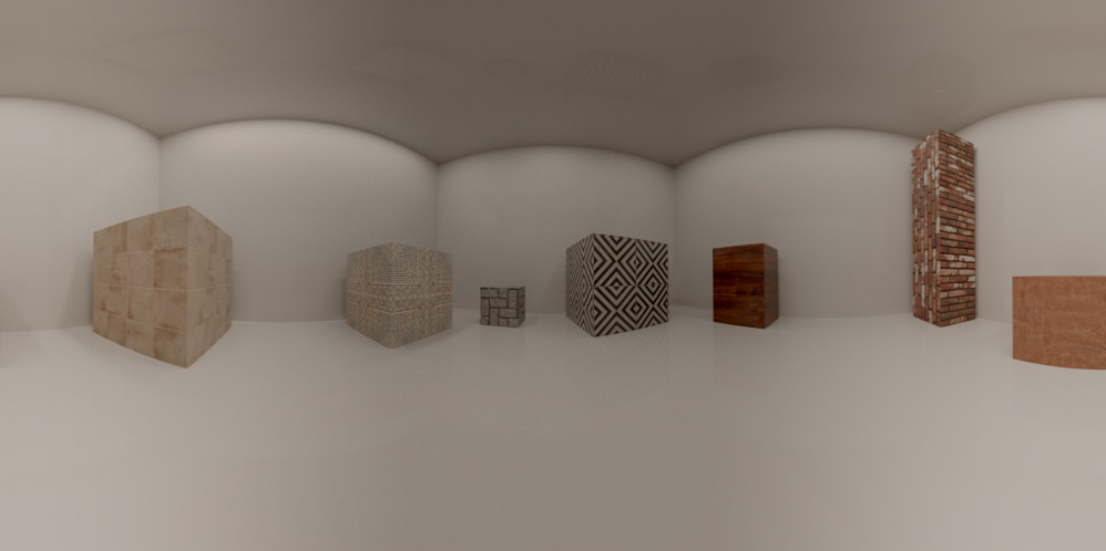 Istraživanje počinje formiranjem manjeg prostora dimenzija 4×4 m sa prostim geometrijskim oblicima. Na oblike su postavljeni materijali i izvršeno je renderovanje korišćenjem spherical kamere u equirectangular formatu.