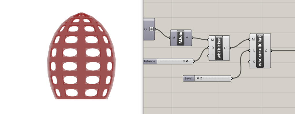 - WbJoin je spojio više meshova u jedan jedinstven mesh; Wb Thicken je dao debljinu strukturi, a WbCatmullClark je dao “smooth” formu.