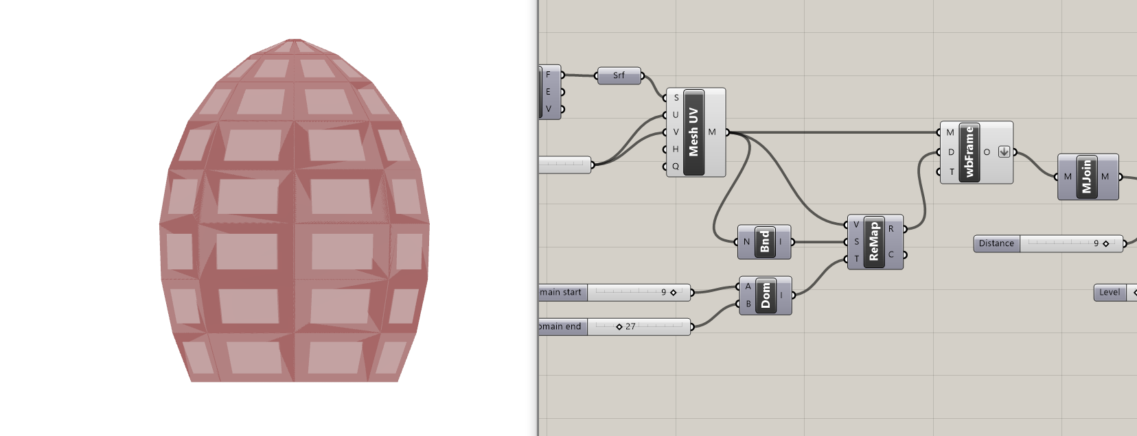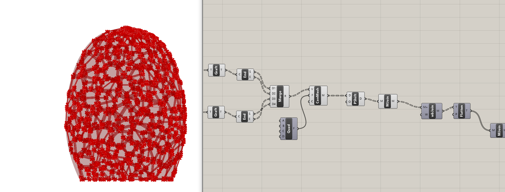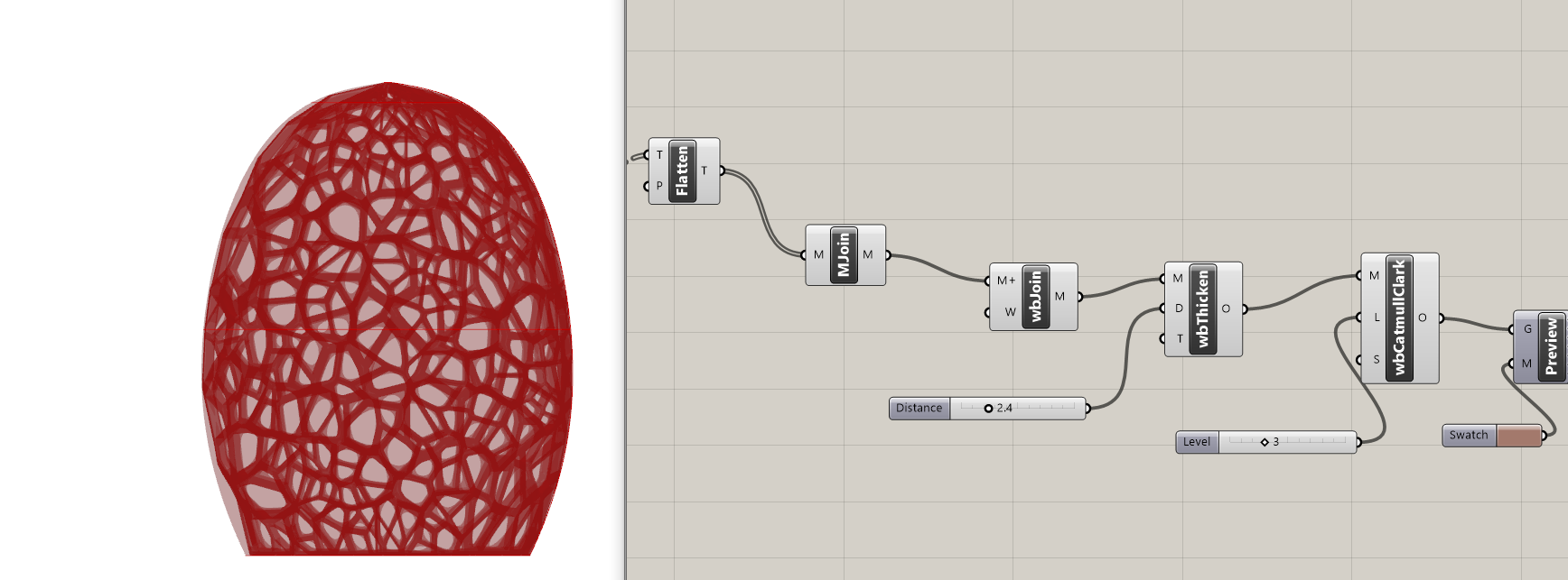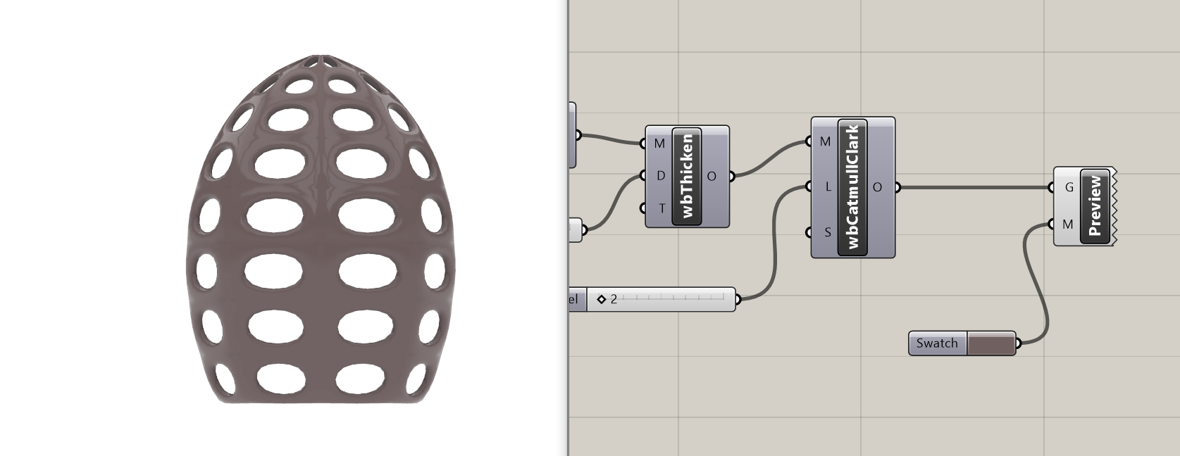 - WbJoin je spojio više meshova u jedan jedinstven mesh; Wb Thicken je dao debljinu strukturi, a WbCatmullClark je dao “smooth” formu.