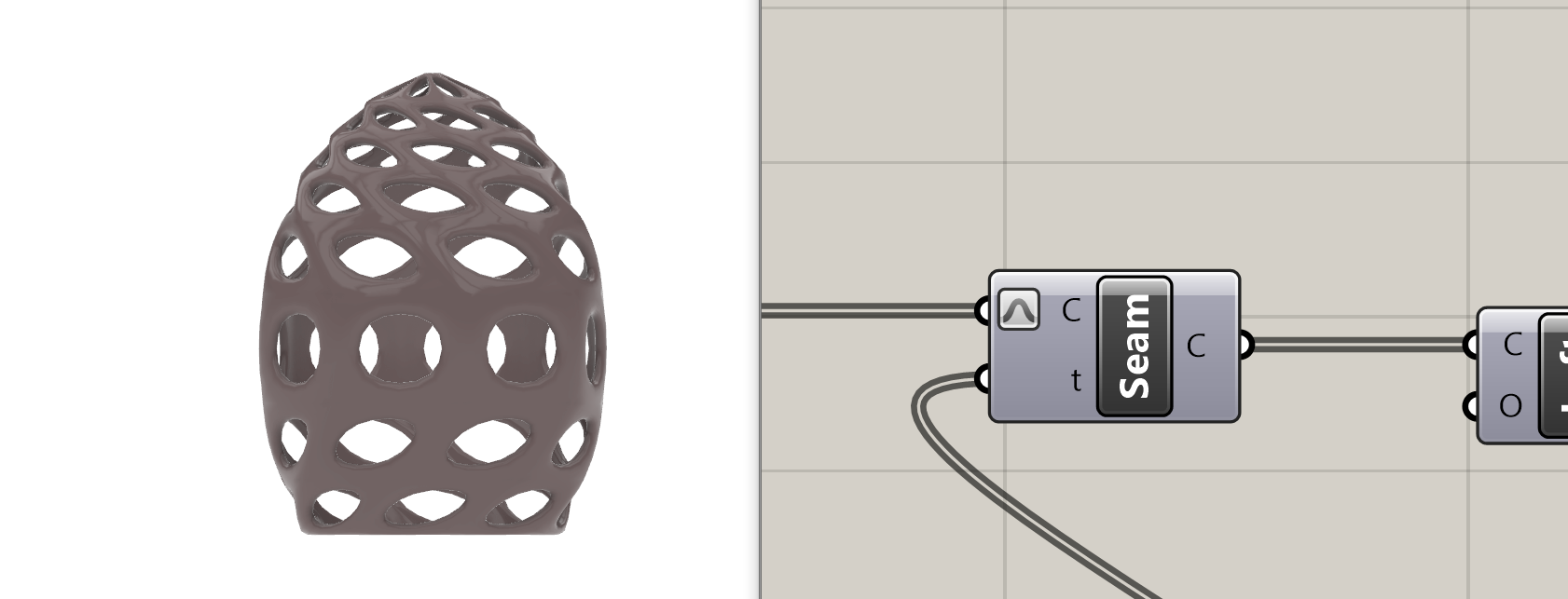 - parametrizacijom krivih u Seam komponenti, dobija se struktura “iskrivljenih” otvora, koja više odgovara nepravilnoj formi samih radiolarija, ali opet ne dovoljno.