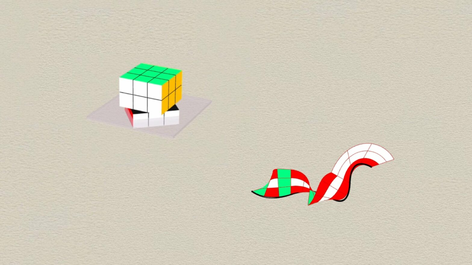 Kao i kod prethodnih primera, algoritam je izveden na već složenoj kocki u obrnutom redosledu, što je omogućilo praćenje svih promena boja i prostorne orijentacije. Na osnovu tih promena formirana je složena slobodna površina, koja vizuelno prikazuje ritam, kontraste i međusobne odnose poteza.