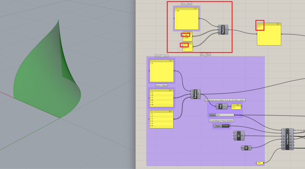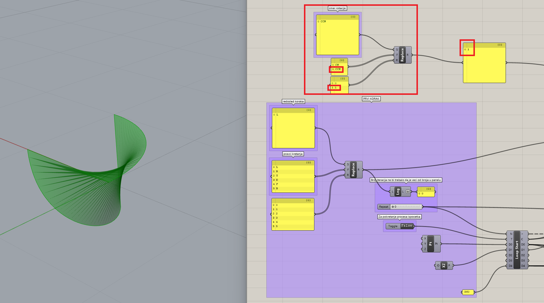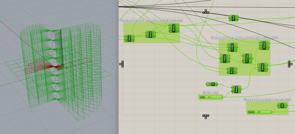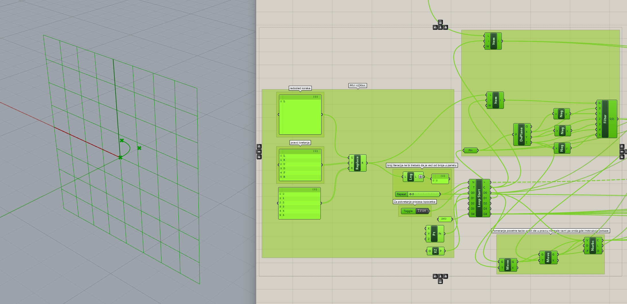 Fotografija 3: Grafički prikaz dobijene krive, primer pravca kretanja u levo; Prikaz koda u grasshopper-u