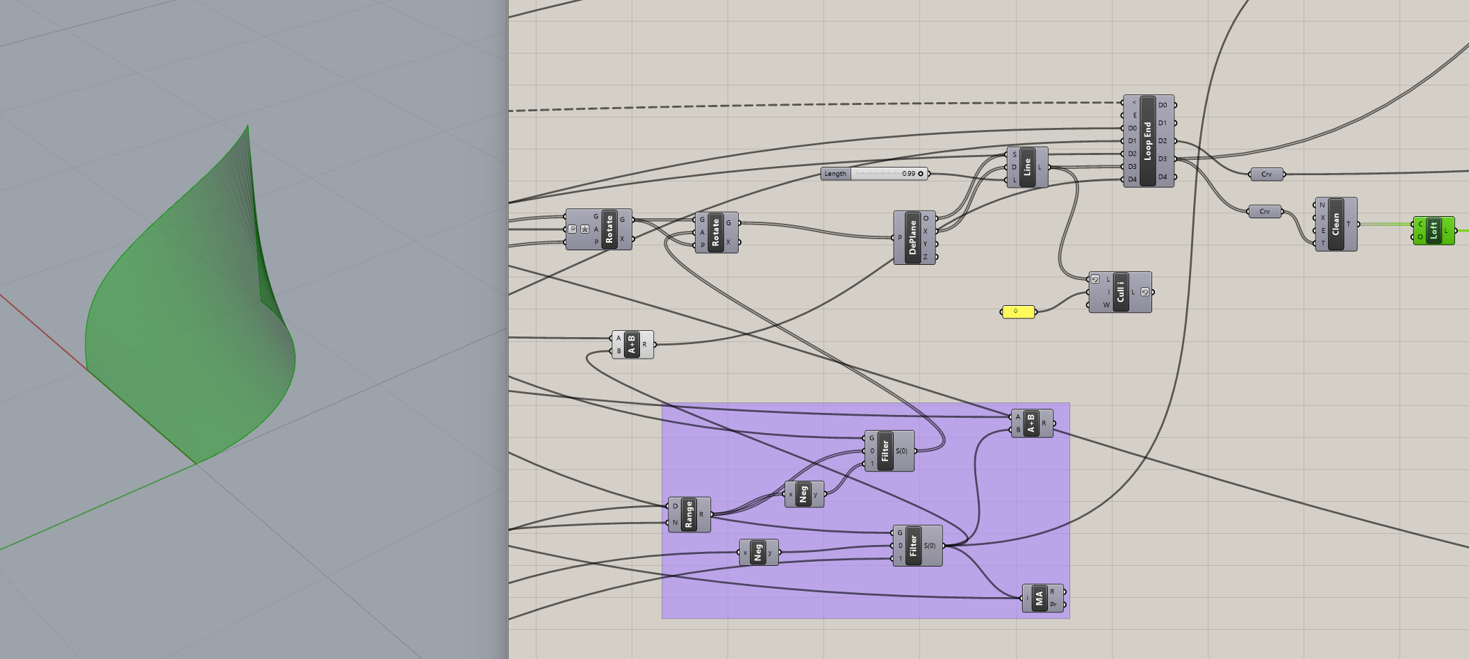 Nakon što se definiše niz krivih koje predstavljaju pravce kretanja, pristupa se formiranju površine koja ih povezuje. Površina se generiše korišćenjem Loft komande u programu Grasshopper, kojom se više sukcesivno formiranih krivih spaja u jedinstvenu geometrijsku celinu.