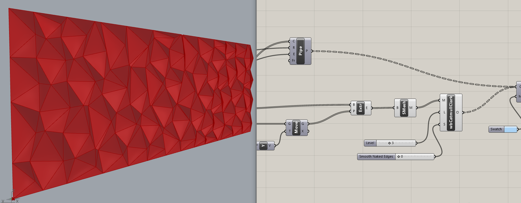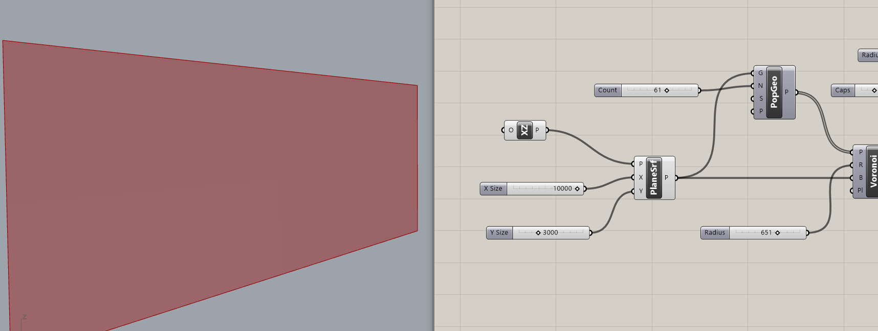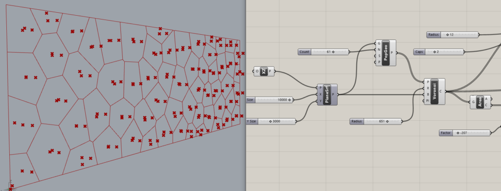 Unutar definisanog okvira primenjena je komponenta Voronoi, kojom je formirana trodimenzionalna mreža ćelija, a pre njega korišćen je Populate Geometry za generisanje skupa slučajnih tačaka unutar definisanog okvira. Pomoću Move i Extrude izbačene su tačke van ravni za kreiranje “bubble” efekta.